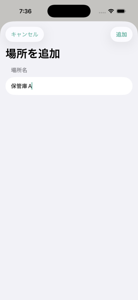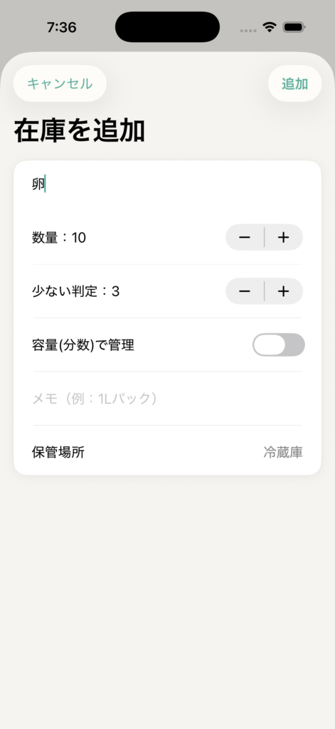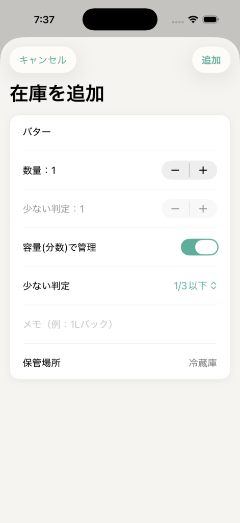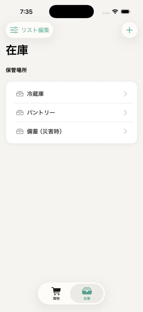 「在庫」タブで、冷蔵庫/パントリーなど保管場所を作ります。
