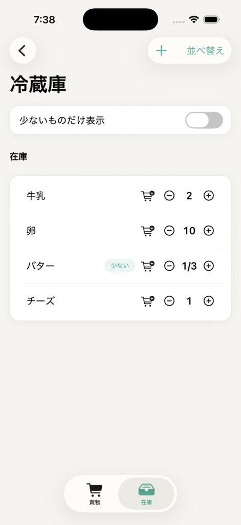 在庫を管理して「少ない」を見逃さず、必要なものだけ買い物リストへ追加できます。